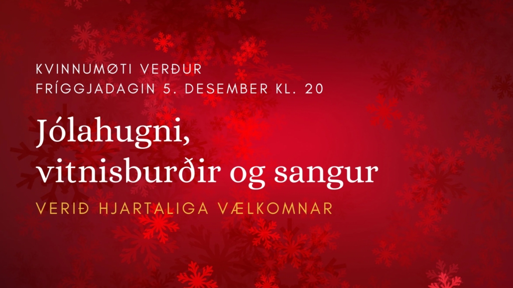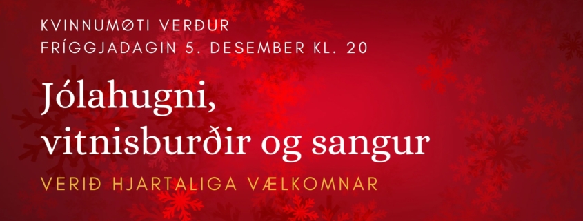 Fríggjadagin 5. desember verður kvinnumøti í Betesda kl. 20 við jólahugna og sangi. Edna Reginsdóttir Steinberg og Ró á Lakjuni Simonsen hava vitnisburð.
